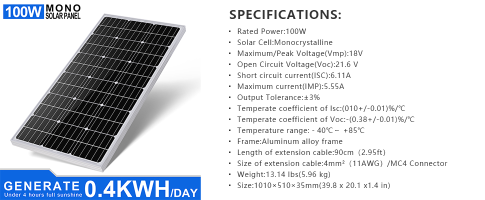 100Watt aluminum frame and tempered glass panel for extended outdoor use, allowing the panels to last for decades.Monocrystallin panel's compact design with the size of 39.8 x 20.1 x 1.4 inch (Height, Length and width). The IP66 waterproof panel can also withstand high winds (2400Pa) and snow loads (5400Pa).