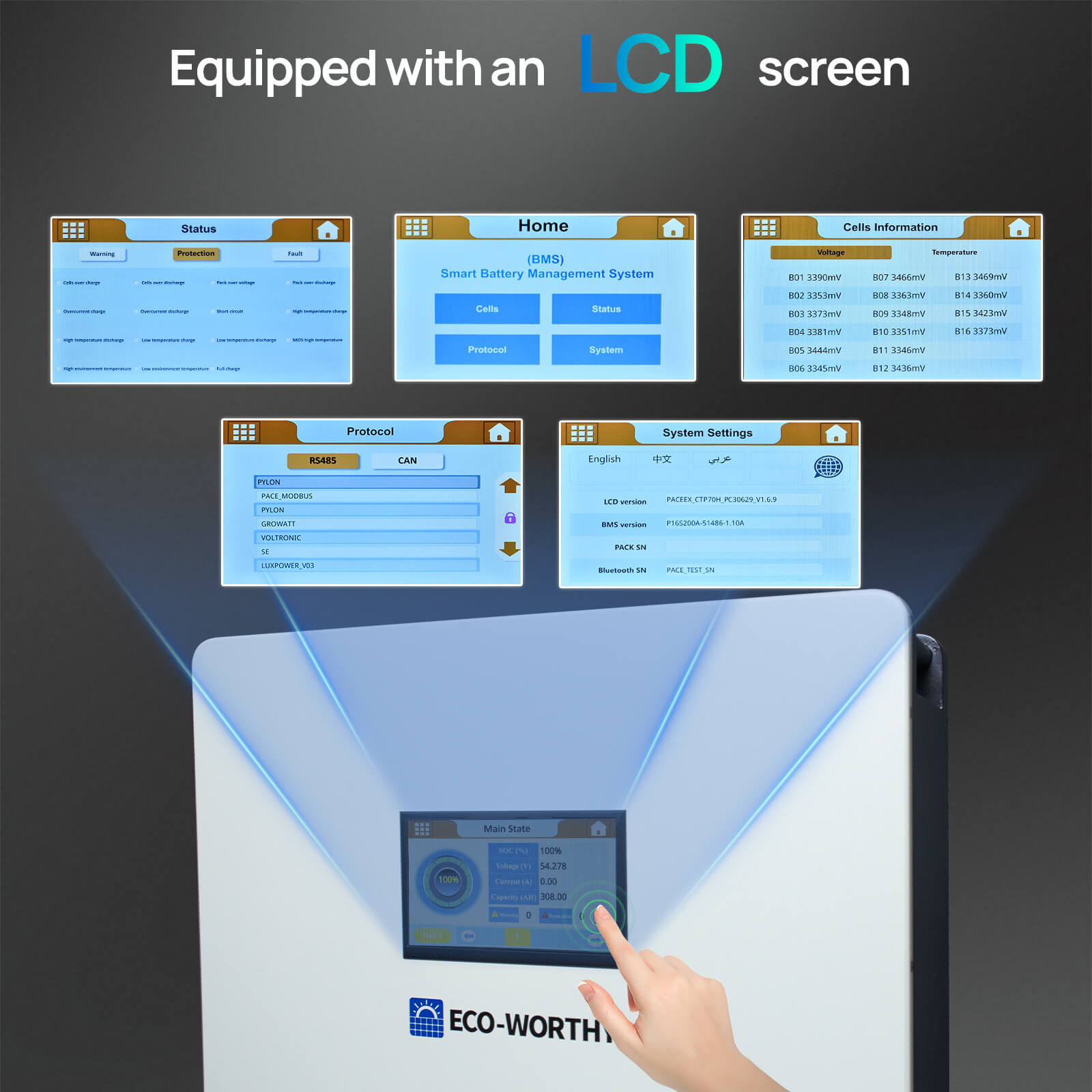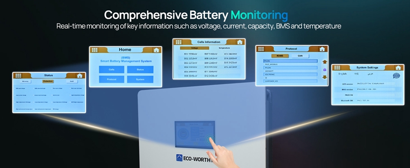 Convenient Monitoring: This battery features an upgraded, larger display that clearly shows key information, including the capacity, voltage, current, temperature, and cell status of both the master and slave batteries, built-in communication interface supports connection to the host computer or inverter for communication.