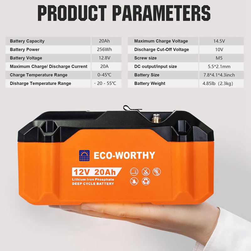 ·Longer Life Span: Up to 80% capacity for 3000 cycles in recommended conditions. The typical SLA has 300-400 cycles. ECO-WORTHY Lithium batteries last so long that the price per use is a fraction of traditional batteries.·Lightweight Champion: Our lithium battery is only 1/3 of the weight of a lead-acid battery, easy to move and install. It is an ideal choice for outdoor camping power supply and simple indoor installation.·High Efficiency: It provides up to 95% of their rated capacity while a lead-acid battery is usually limited to 50%. You get all the juice down to the last drop. It can support fast charging or solar panel charging.·Extremely Safe: LiFePO4 batteries are safest battery type available today. ECO-WORTHY lithium battery has a built-in Battery Management System(BMS), we can guarantee the safety and reliability of our batteries.·Wide Application: Suitable for RVs, Solar systems, off-grid, Boats, Fish finders, Power wheels, Scooters, Industry, Hiking, Camping, Backup power supply, etc.