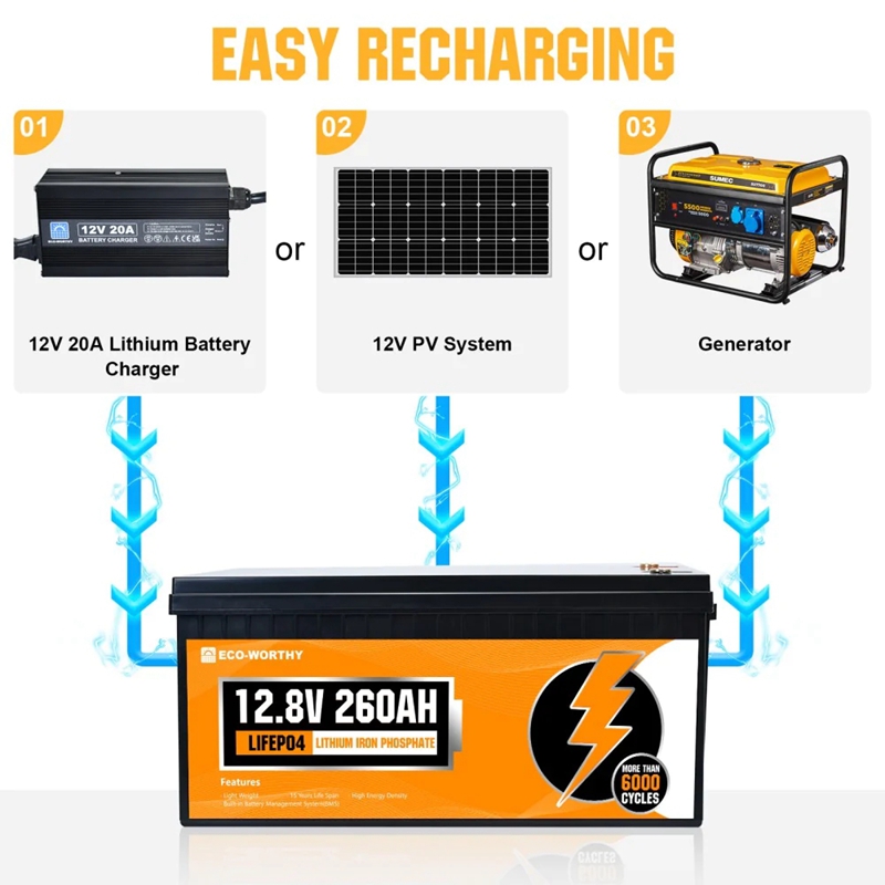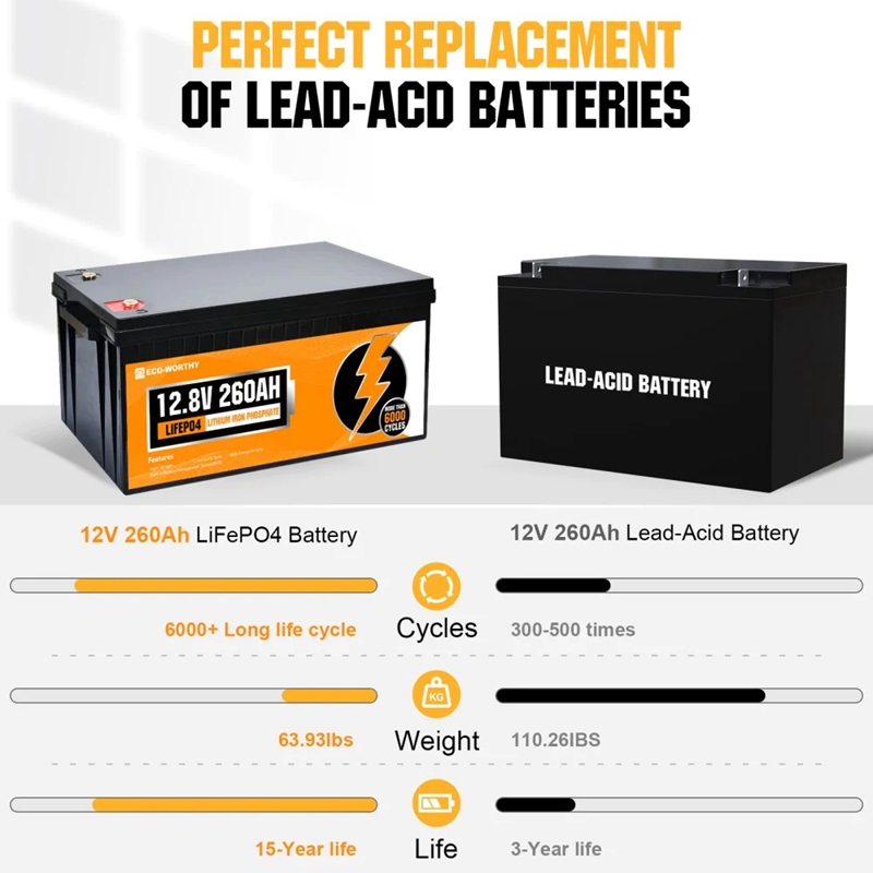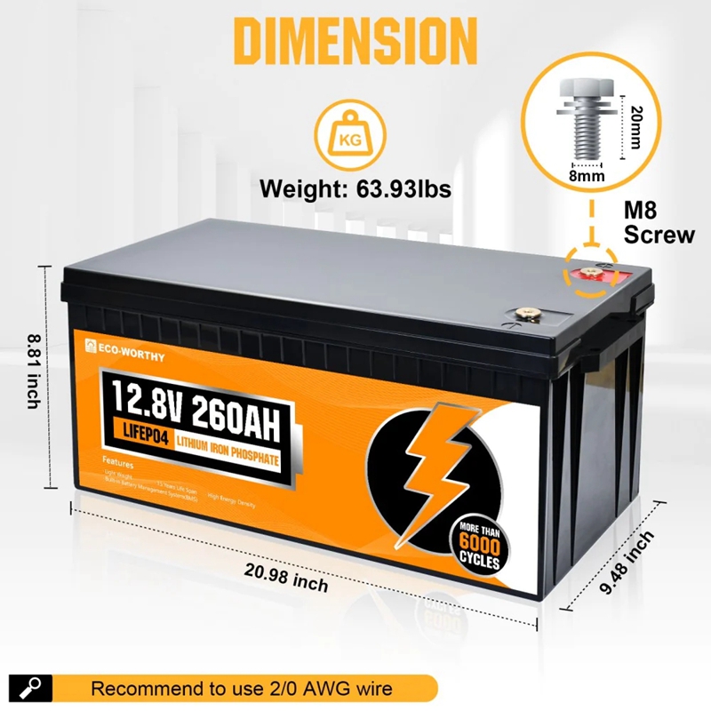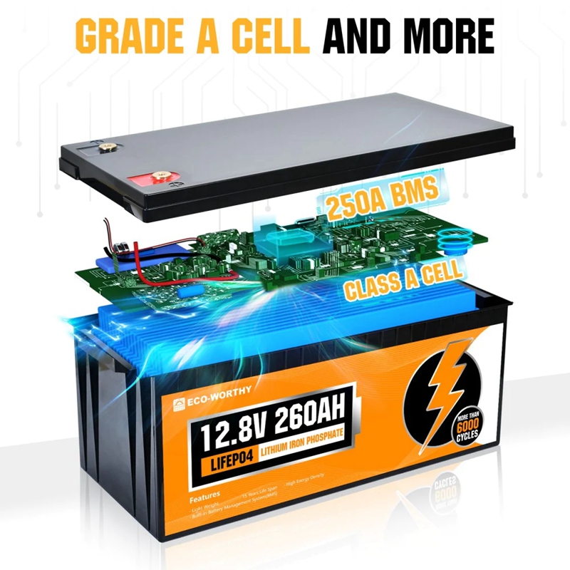 ·20-year Life & 6000+Deep Cycles: ECO-WORTHY's 260ah LiFePO4 Lithium Battery contains 6000+ deep cycles, each lithium battery can run for more than 20 years, which is 3 times longer cycles than other LiFePO4 batteries on the market.·100% Protection: It has a more stable built-in 250A BMS to protect it from overcharge, over-discharge, charge over-current, discharge over-current, short-circuit, cell voltage self balance, high-temp discharge cut off.·Lighter but More Power: Our LiFePO4 Battery has an A-class cell with high energy density, which makes it smaller in size and 1/3 the weight of the lead acid battery at the same capacity, much more convenient for you to remove and place it.·Application: The 260Ah Lithium Iron Phosphate Battery has 3328Wh Energy, and can be expanded to 53.2kwh by wired in 4S4P, Perfect for RV, campers, marine, travel trailer, solar power system, motor homes, UPS, off-grid etc.·US Warehouse & Fast Delivery: 3-5 Days fast delivery for US mainland, we ship the battery from our local warehouse in California. Our online services with quick feedback within 24 hours, if you have any questions, please feel free to contact us, we will do our best to meet your needs.